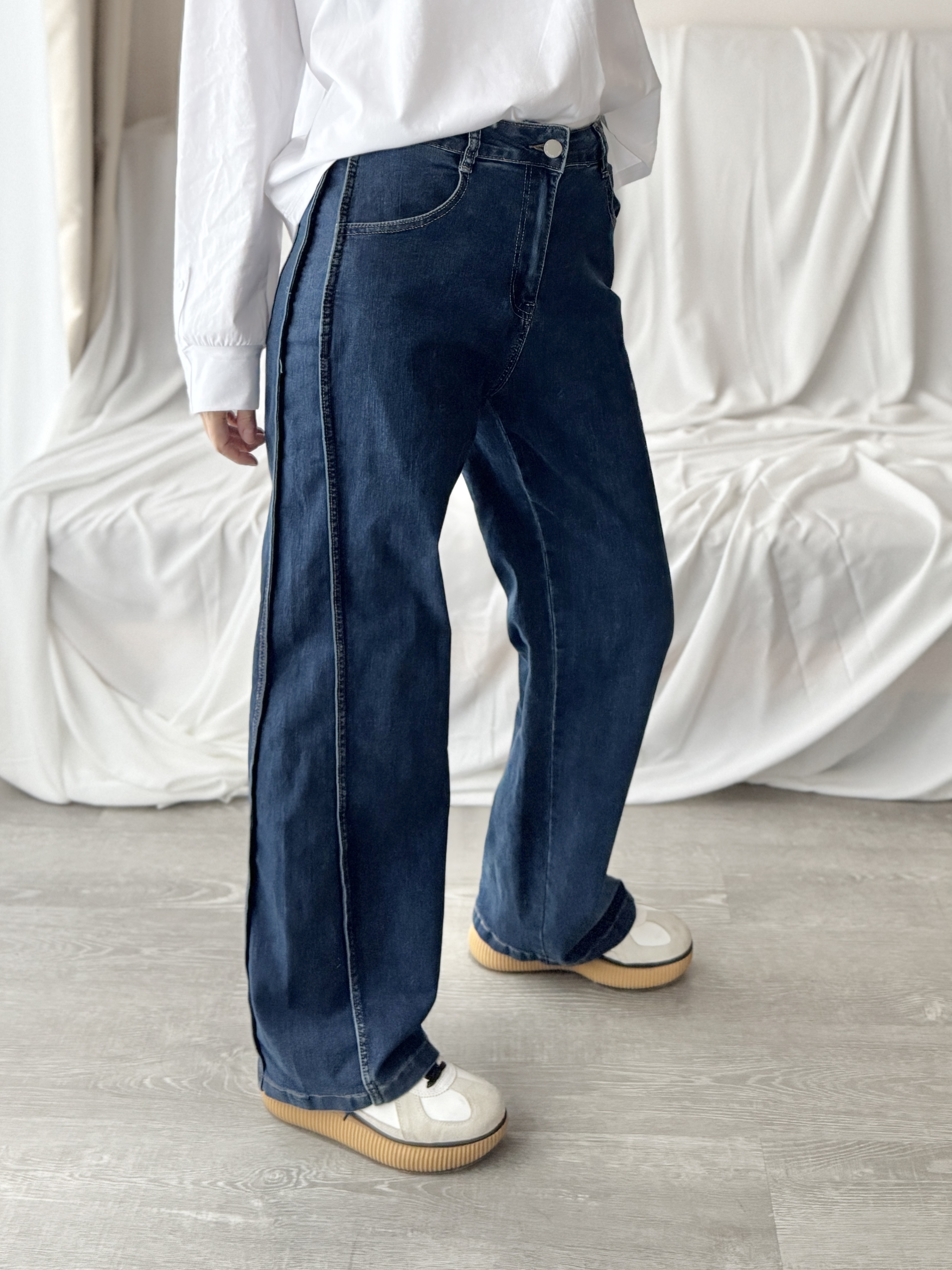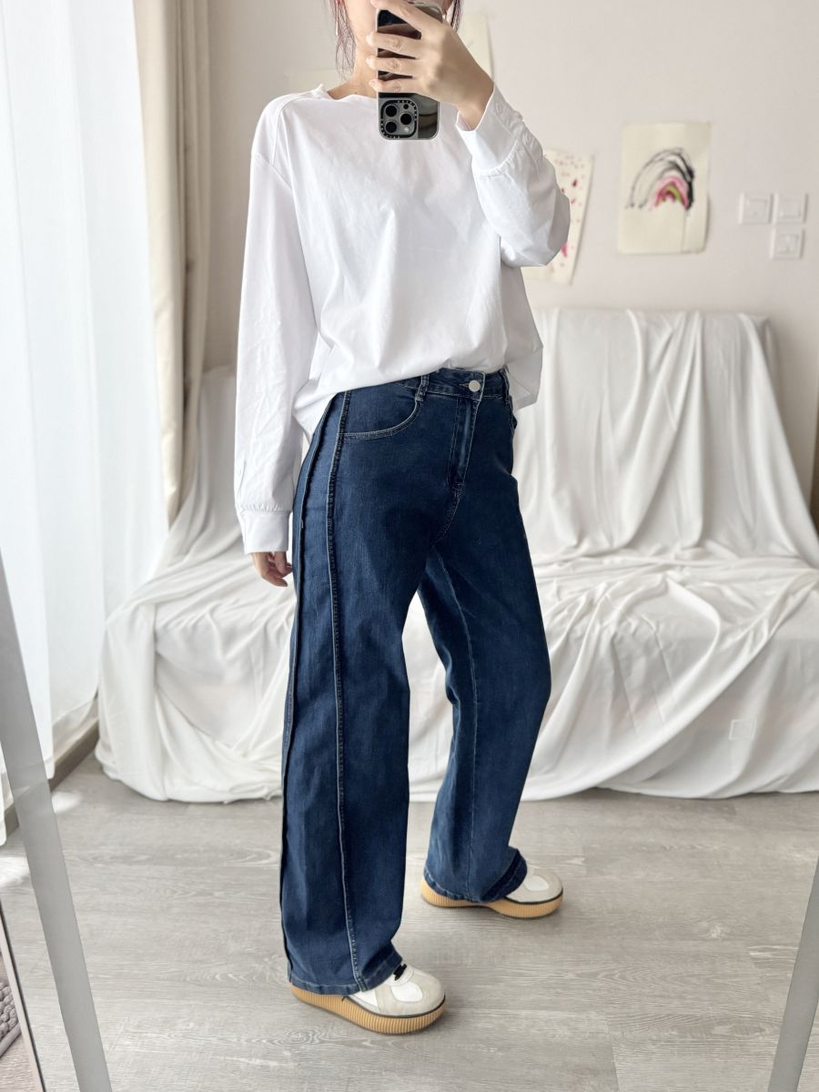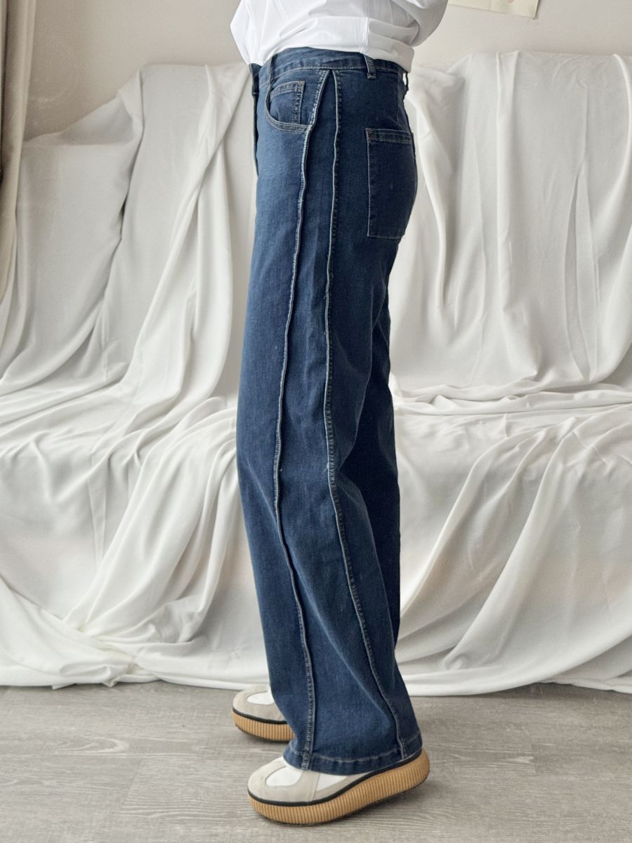 ALine超彈剪接線水洗微喇丹寧褲 (深藍) S-2XL