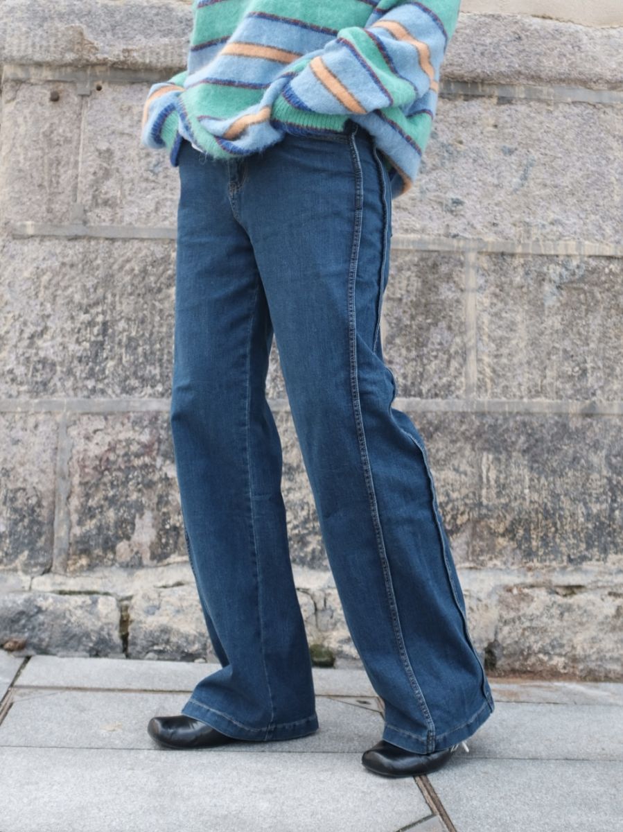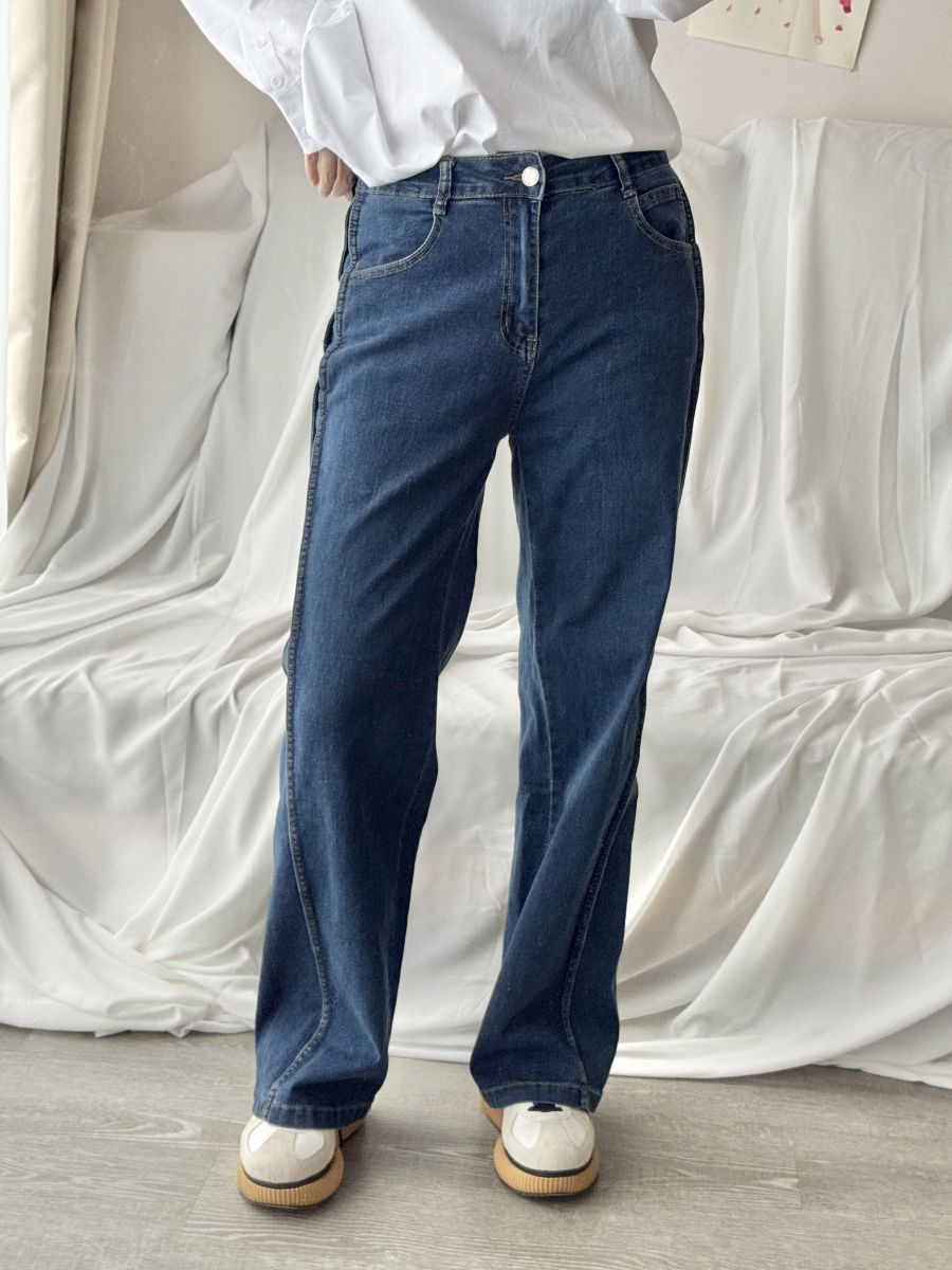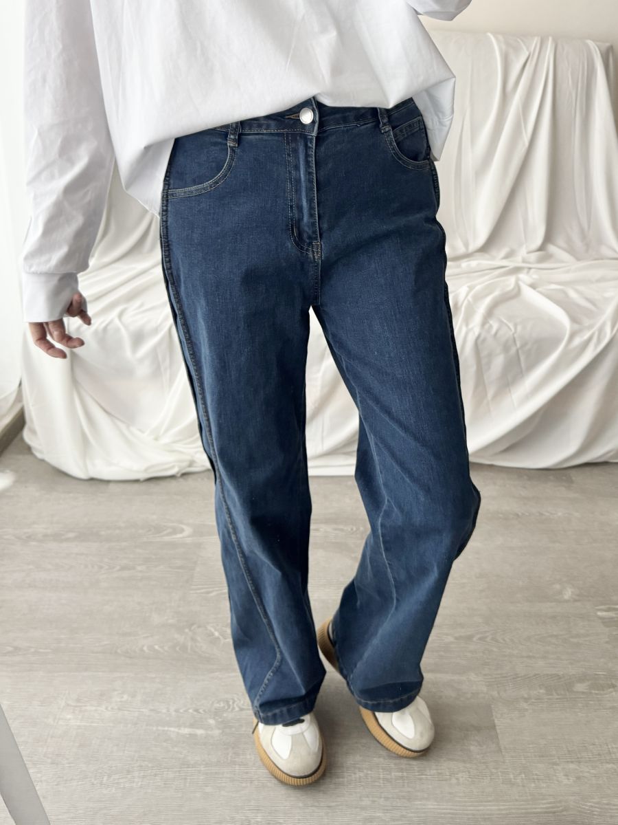 ALine超彈剪接線水洗微喇丹寧褲 (深藍) S-2XL