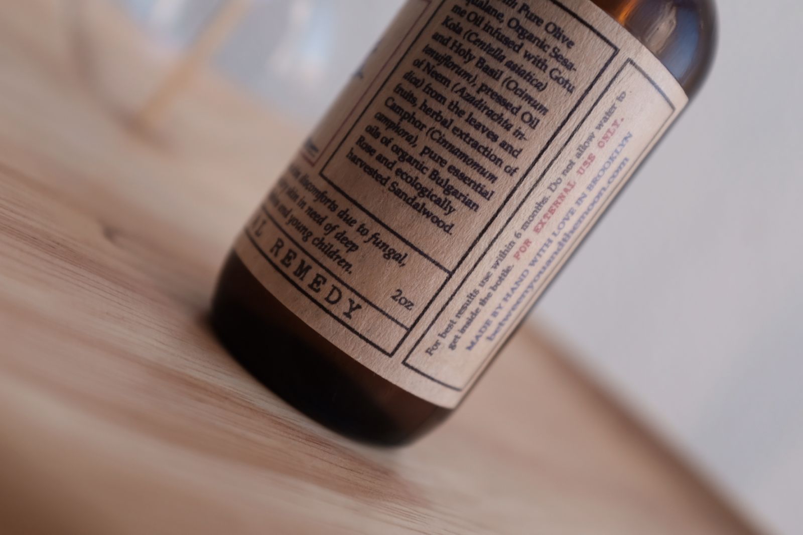 純橄欖角鯊烷油 、有機芝麻油、積雪草油、聖羅勒、有機印楝葉子和果實(印度楝)壓榨油 、草本提取樟樹(樟腦)、有機羅莎大馬士革(保加利亞玫瑰)、生態保護檀香木精油。