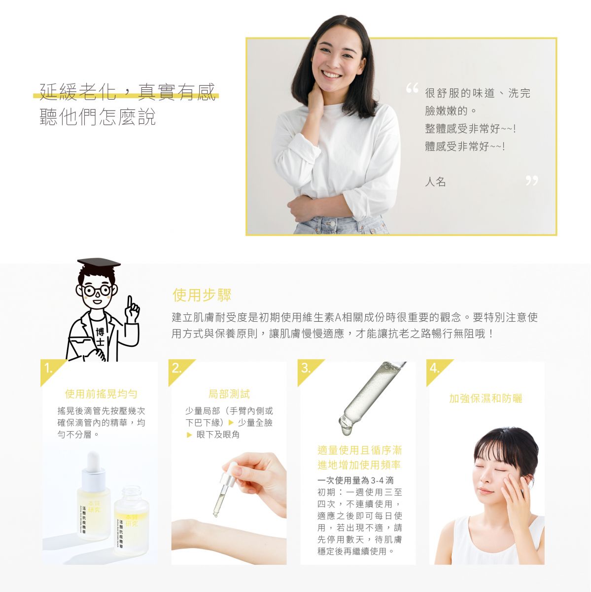 ◆使用方法:每天早上與晚上使用,臉部清潔之後,先將精華液上下搖晃混合均勻後,取適量精華液於掌心,再以手指沾取均勻塗與臉部,約3-4滴可覆蓋全臉,輕輕按壓於臉部。