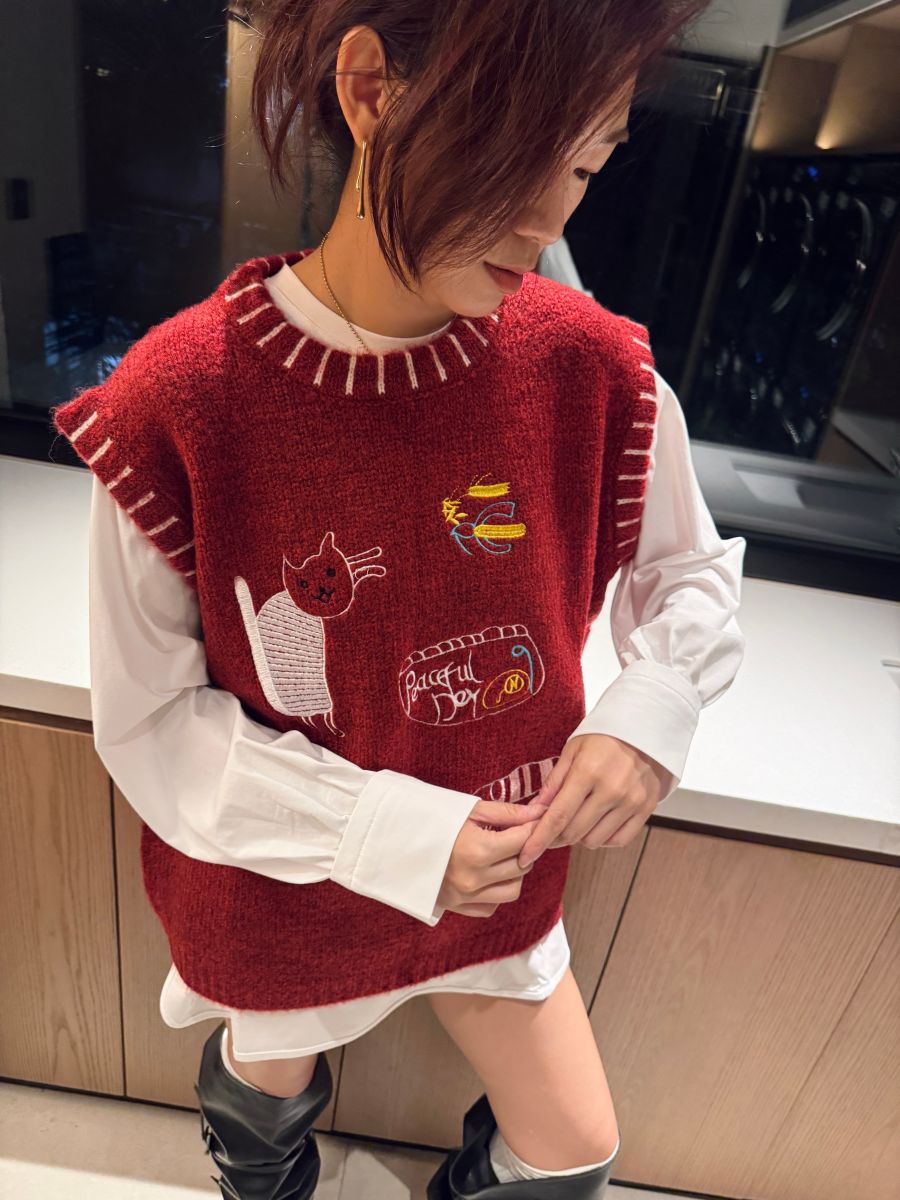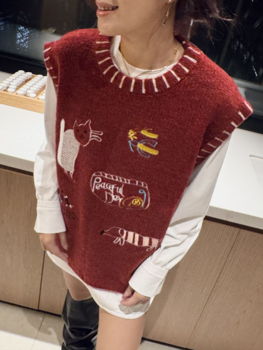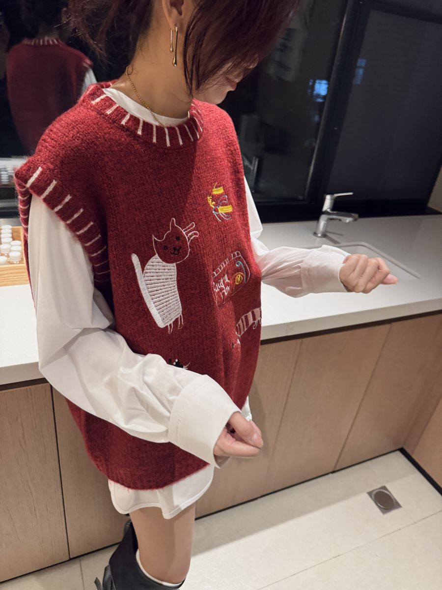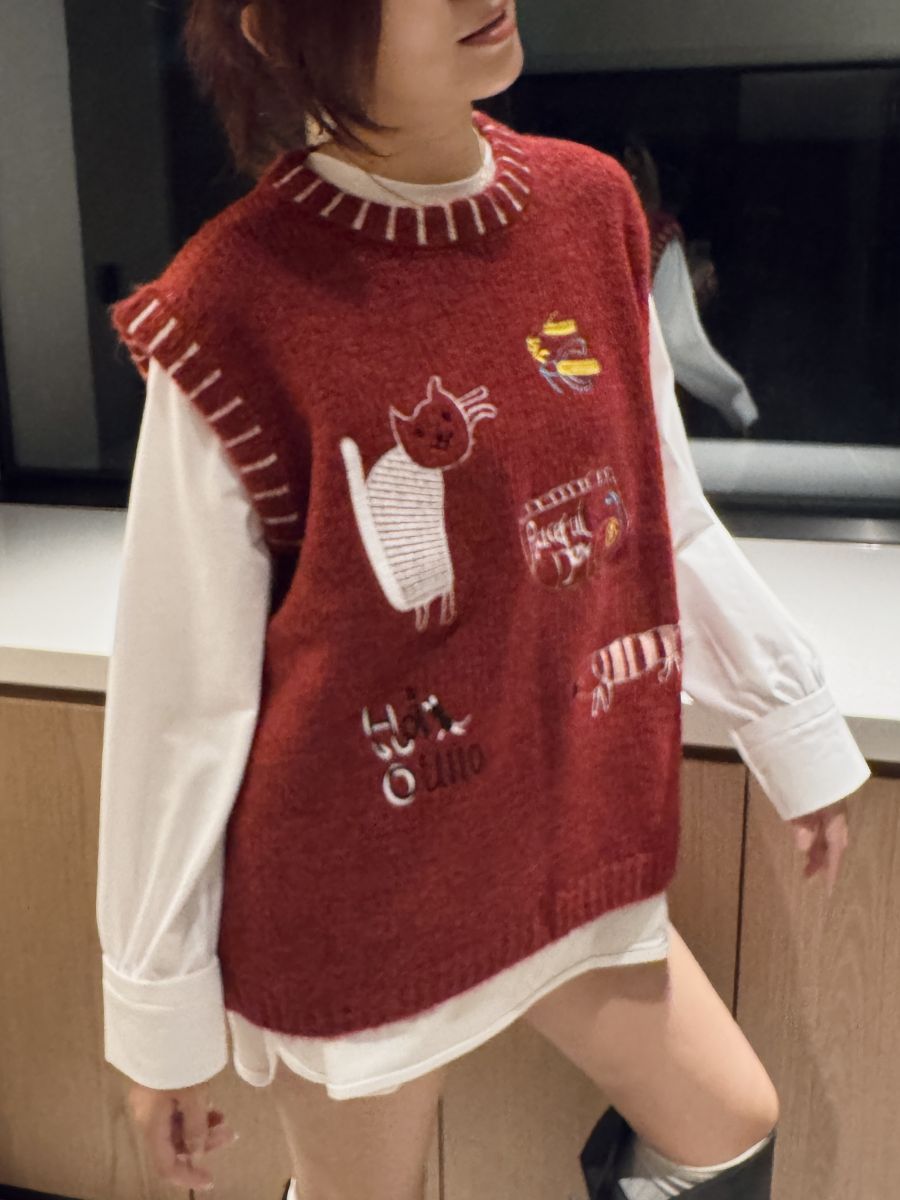 插畫刺繡寬鬆撞色毛衣背心 (紅)