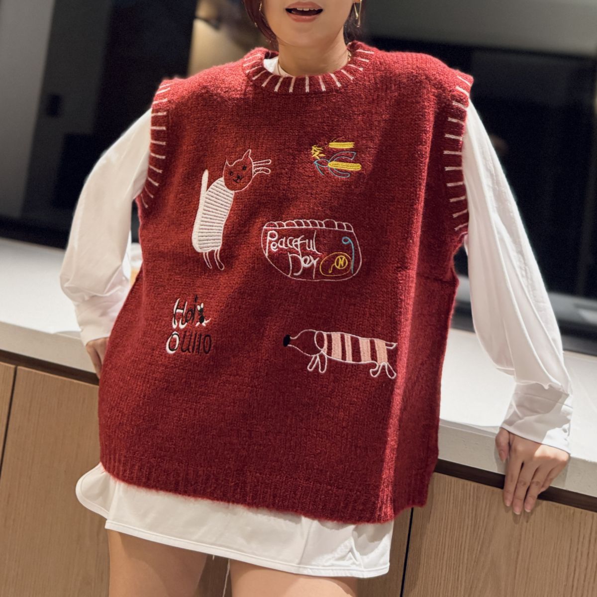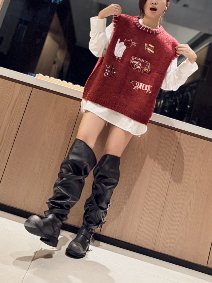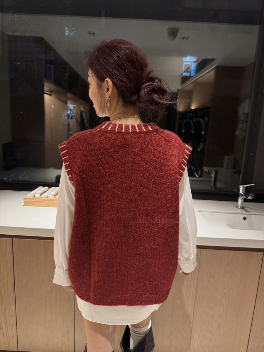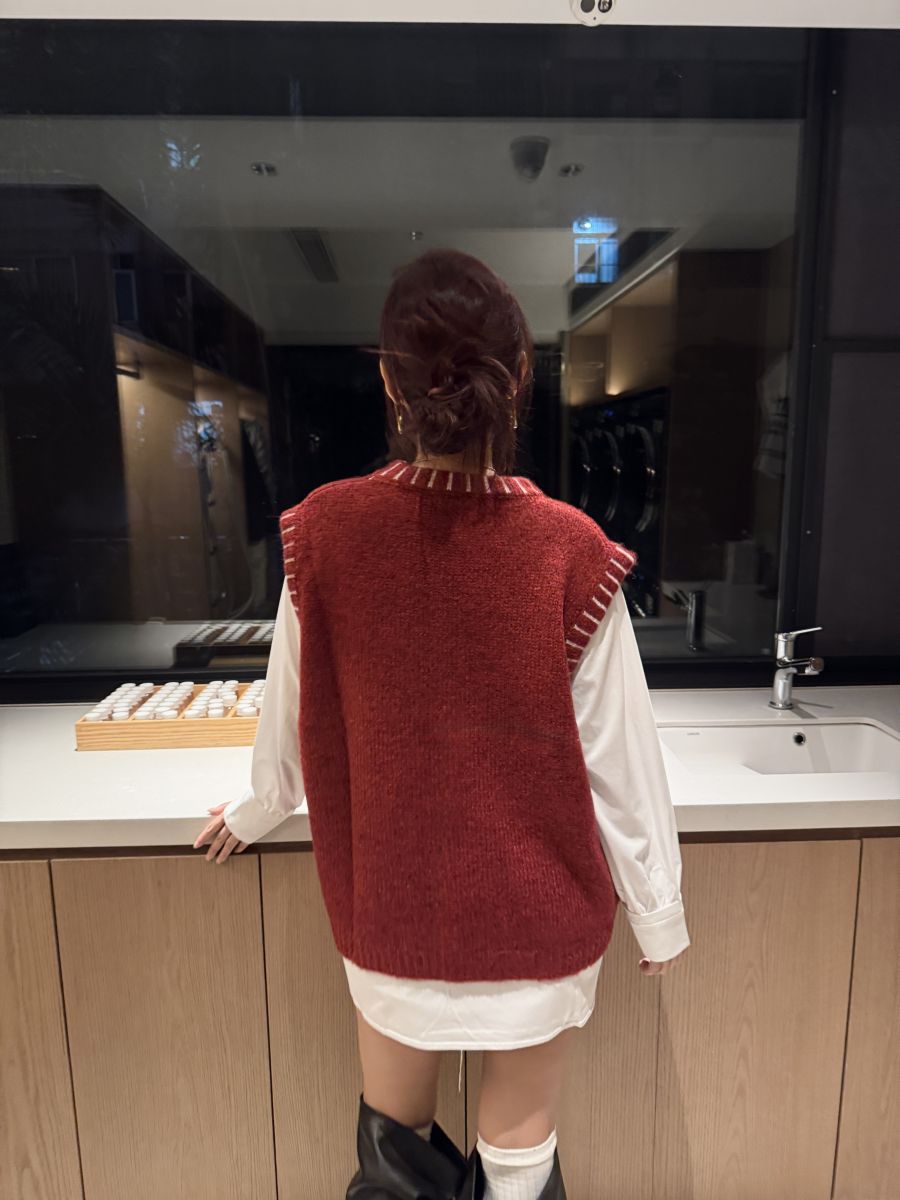 插畫刺繡寬鬆撞色毛衣背心 (紅)