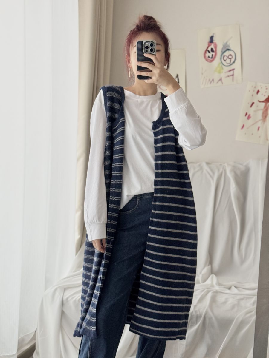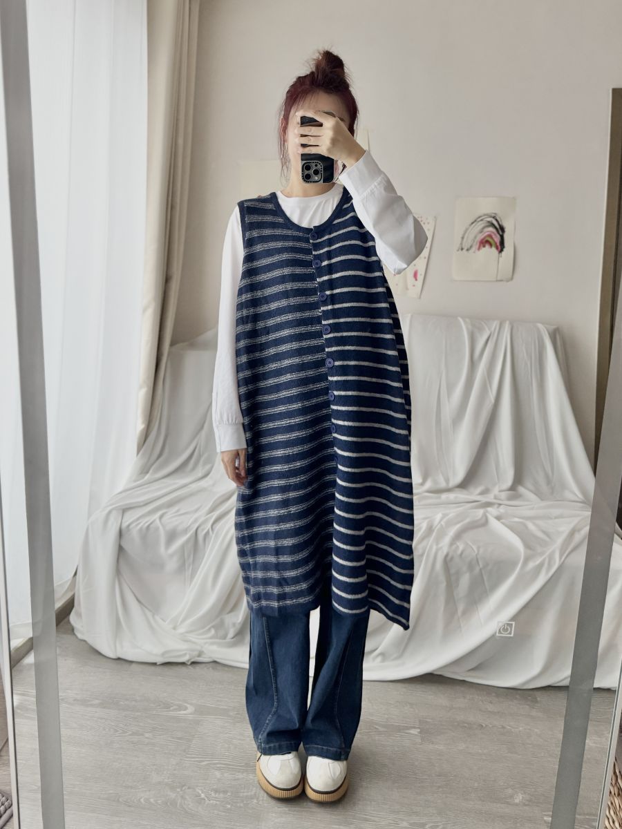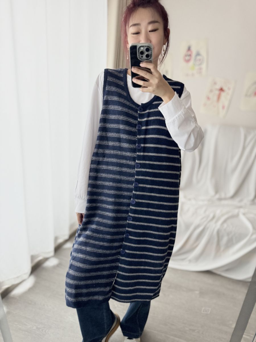 • 不對稱條紋排釦針織長背心 (黃) NT.$1080
