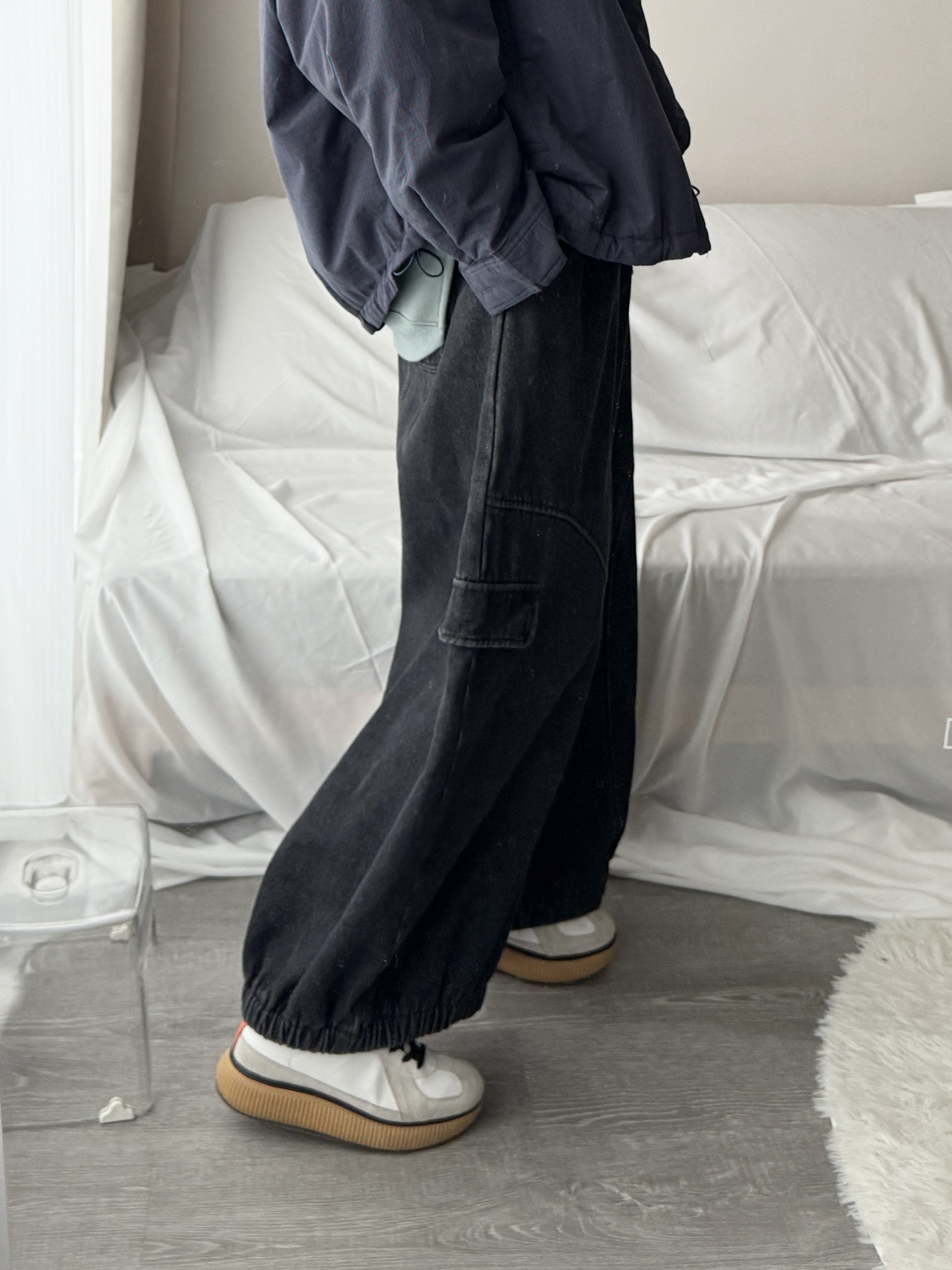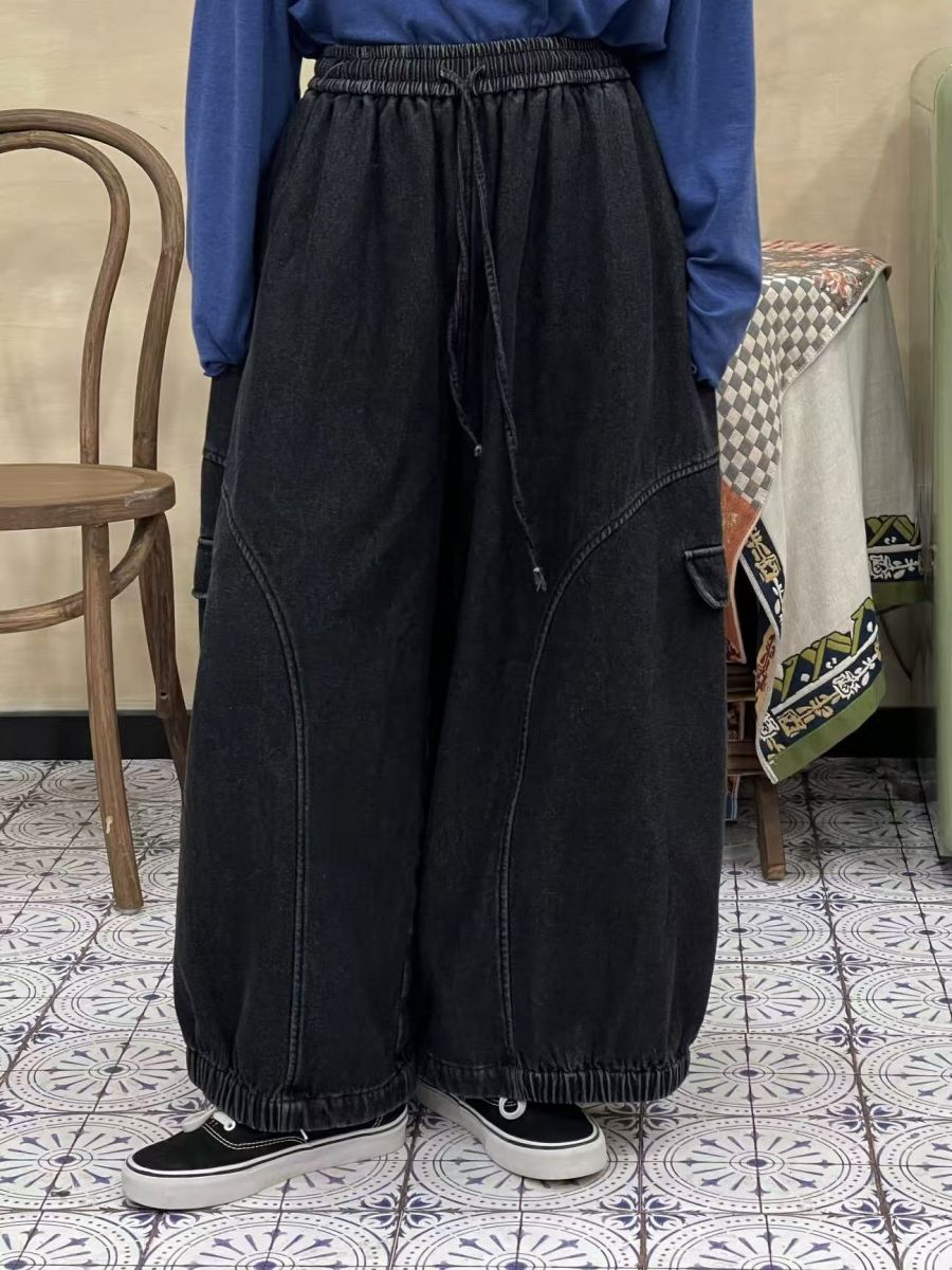 內刷毛!剪接闊腿丹寧工作彎月褲 (黑)
