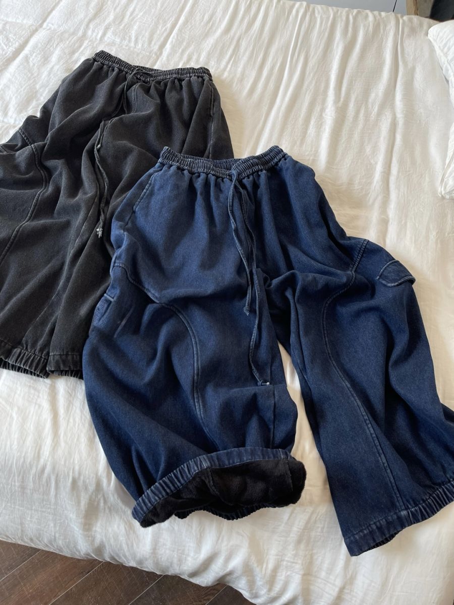 • 內刷毛!水洗丹寧藍色裙擺闊腿 NT.$1280