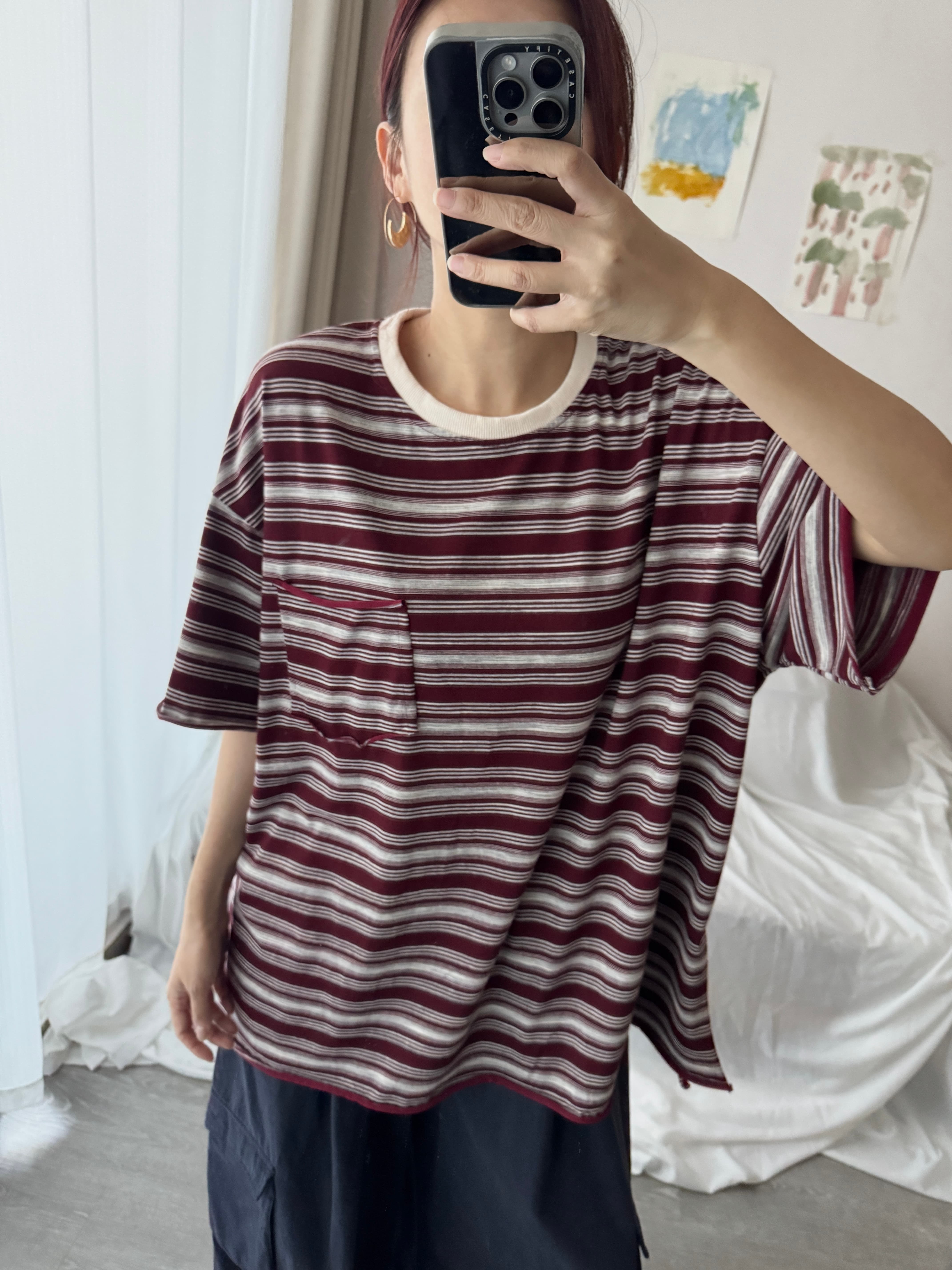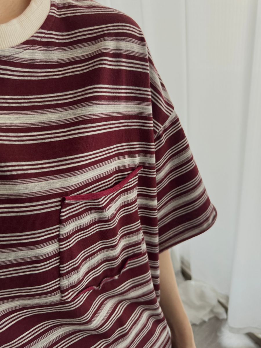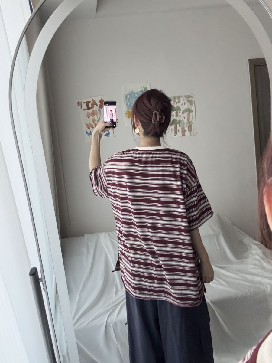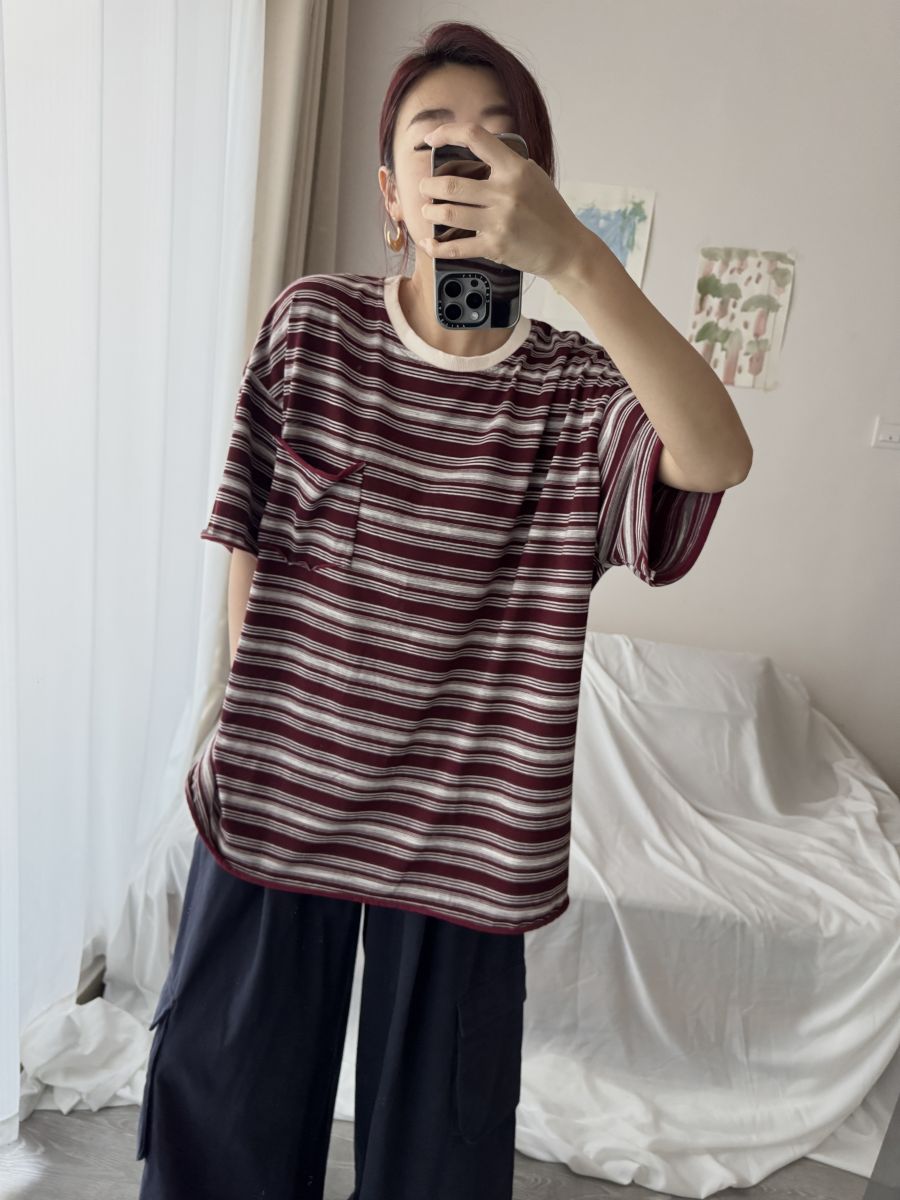 撞色領慵懶條紋不修邊Tee (紅)