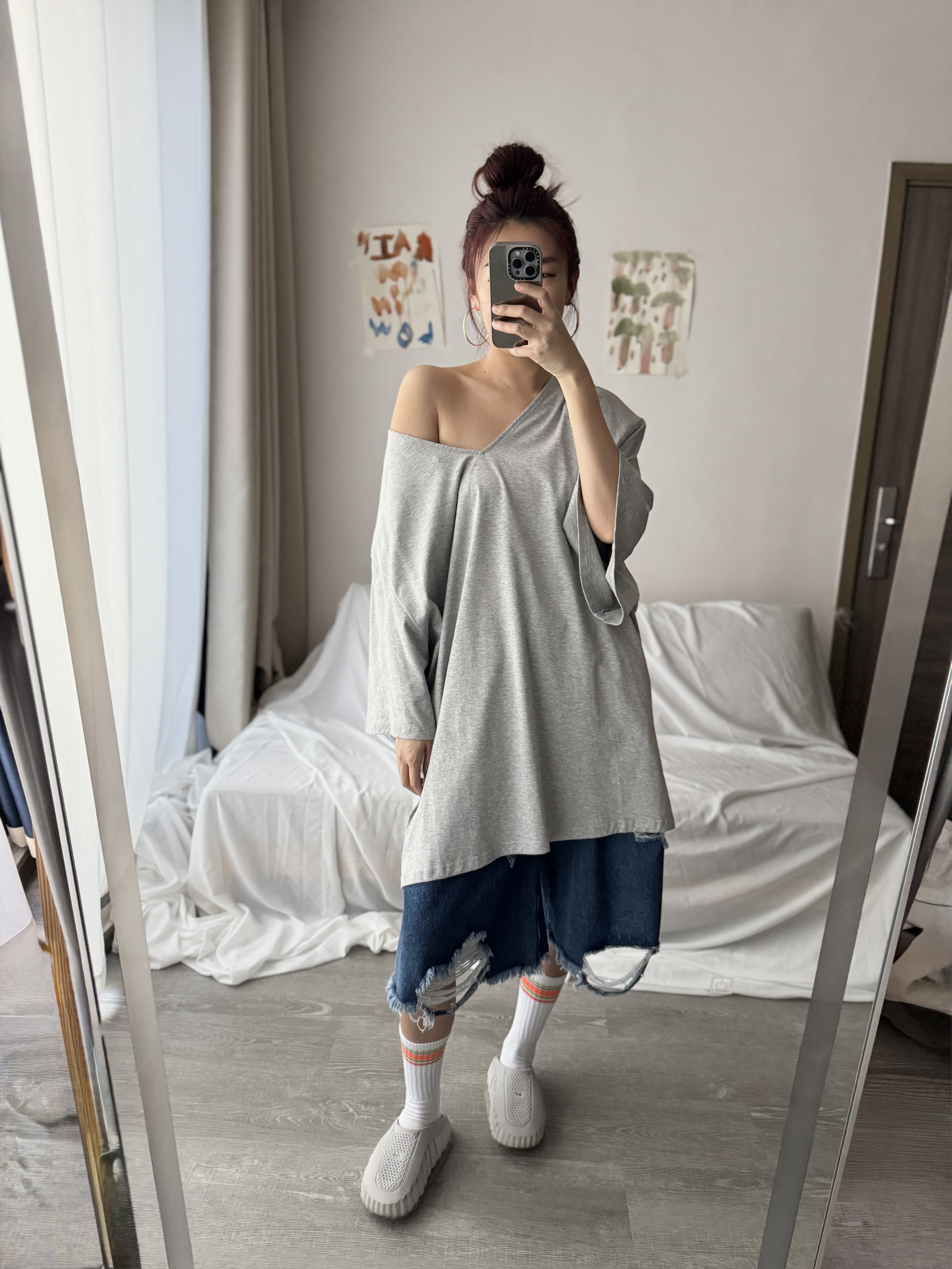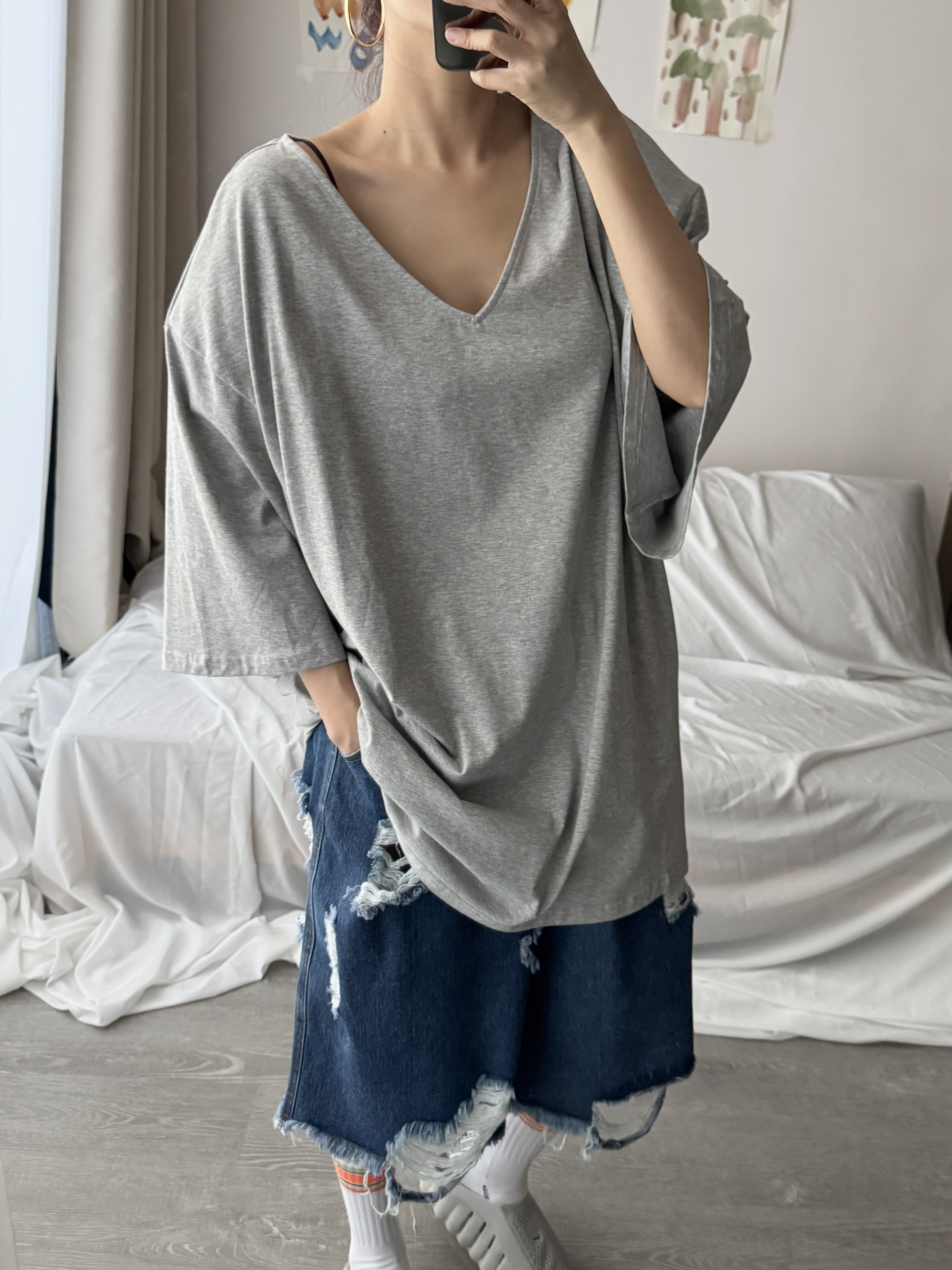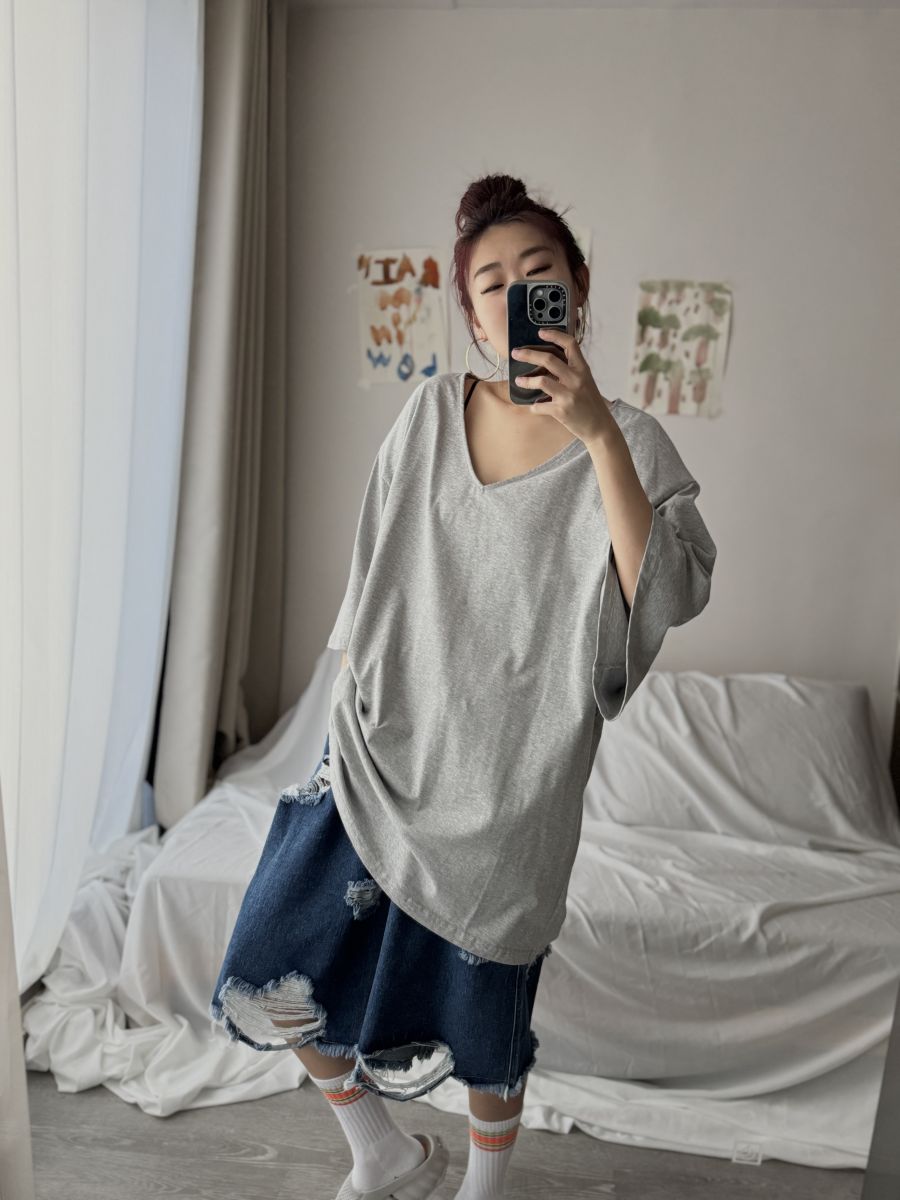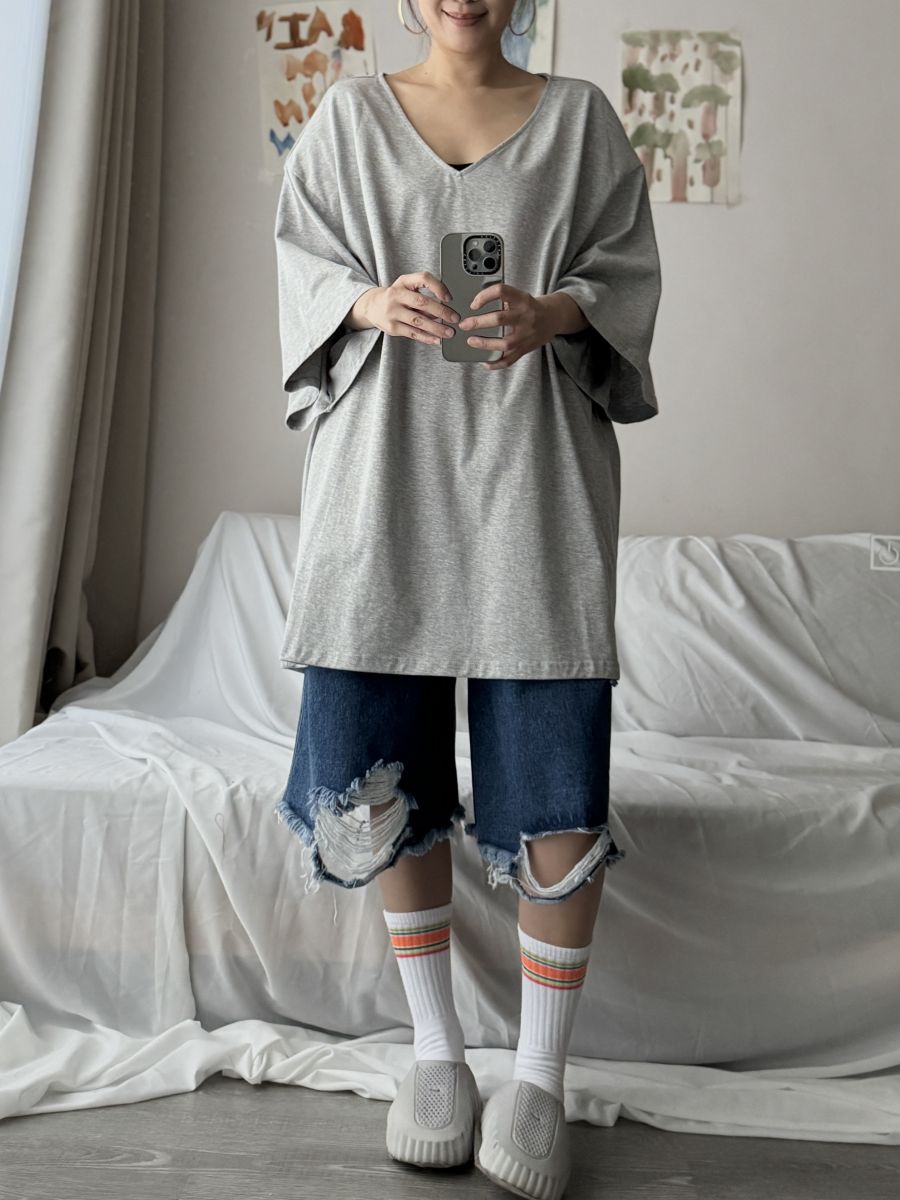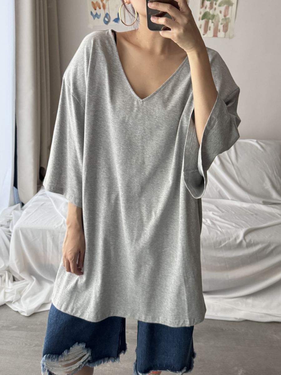 大V領墊肩Oversized上衣 (淺灰)