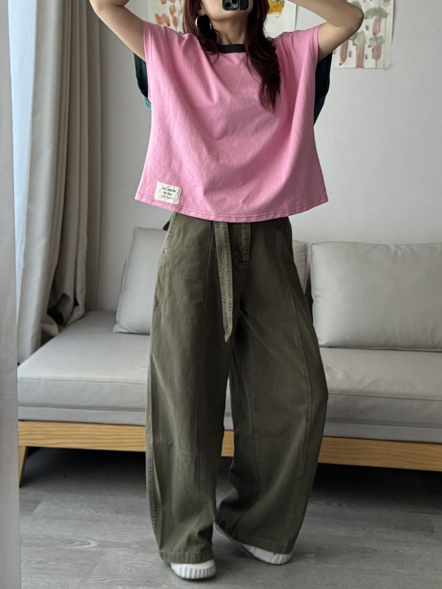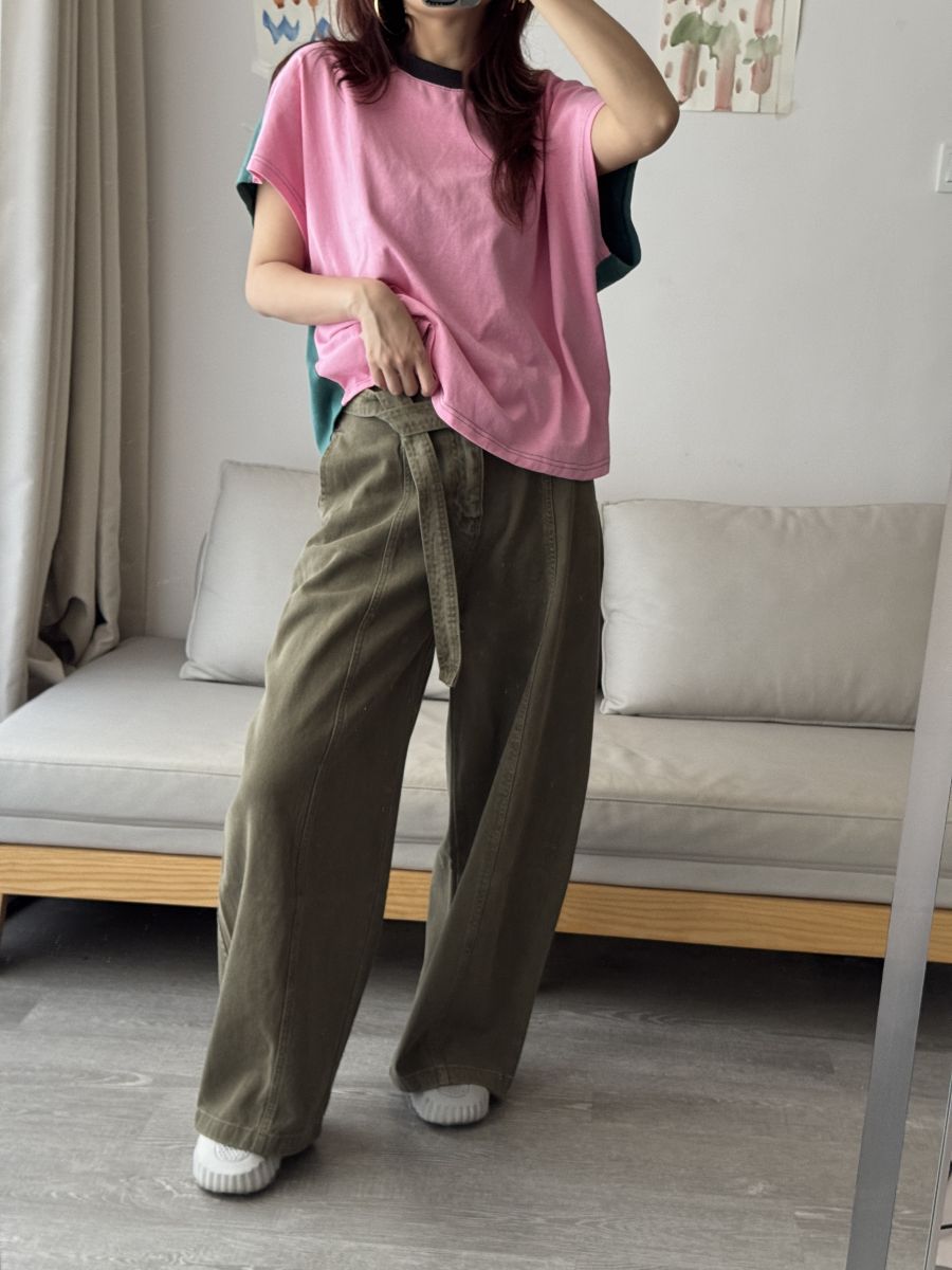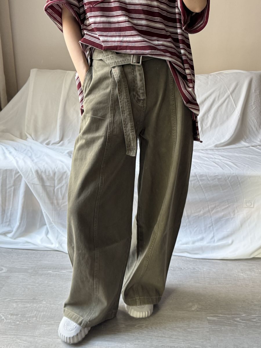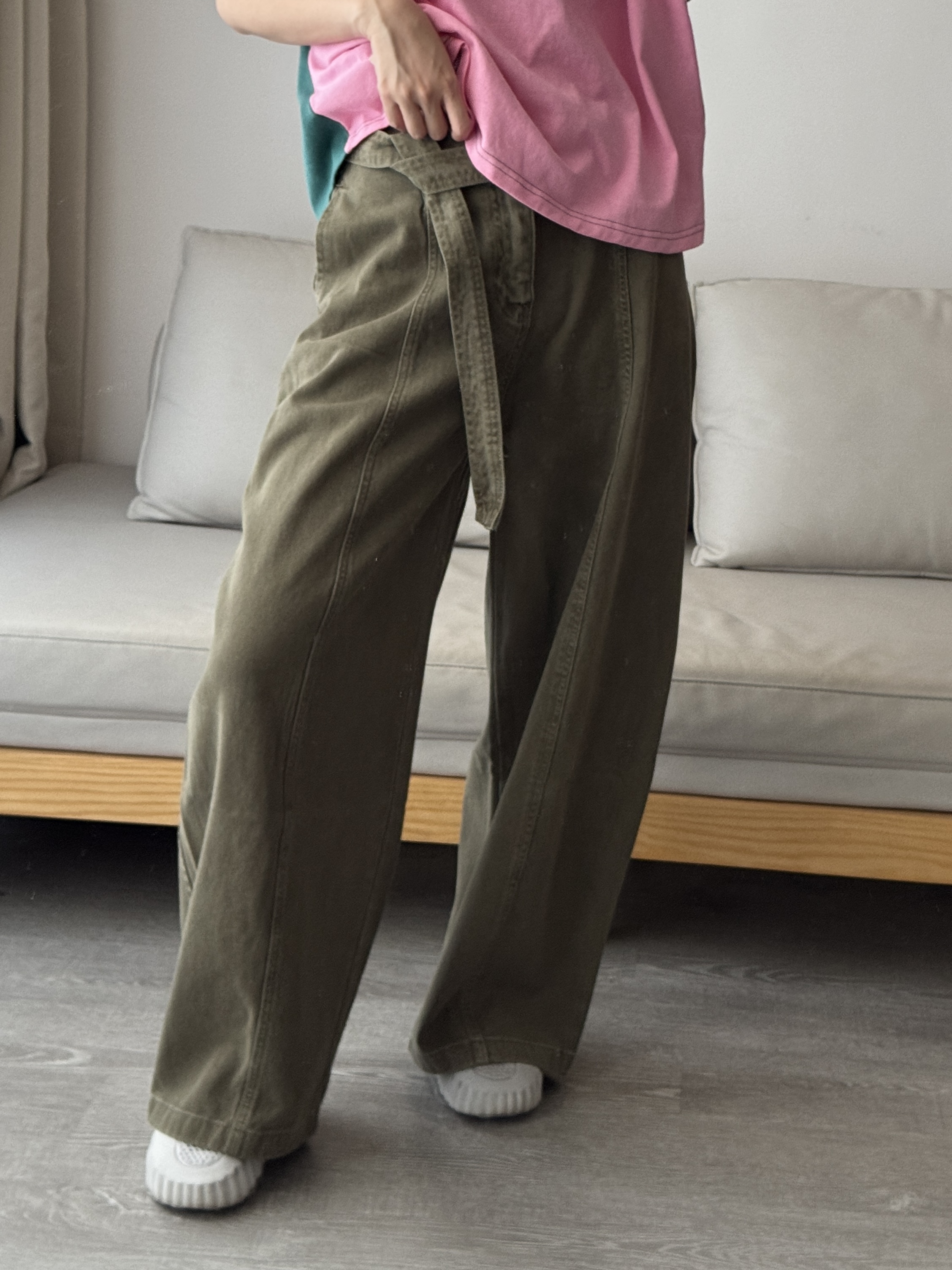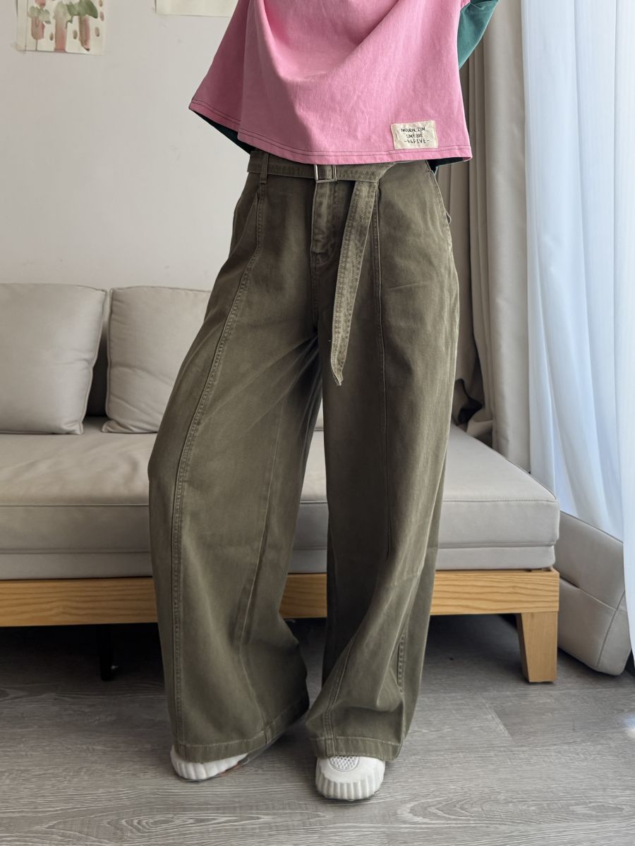 附腰帶!高質感做舊水洗闊腿褲 (軍綠) S-XL