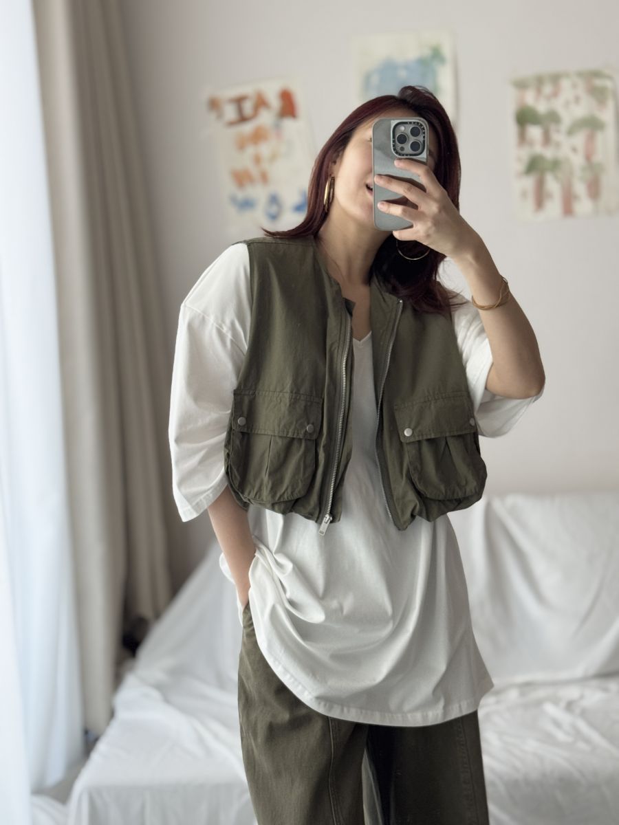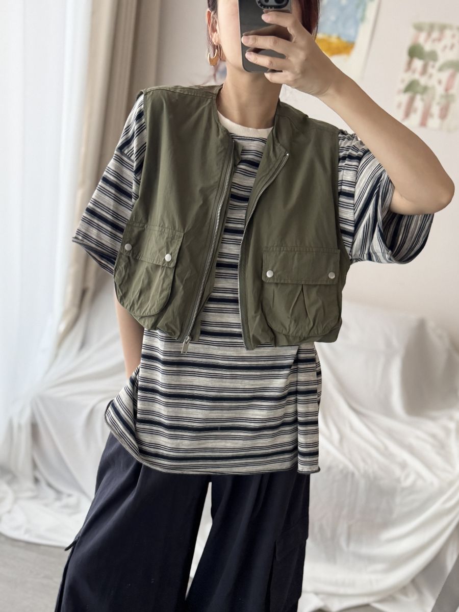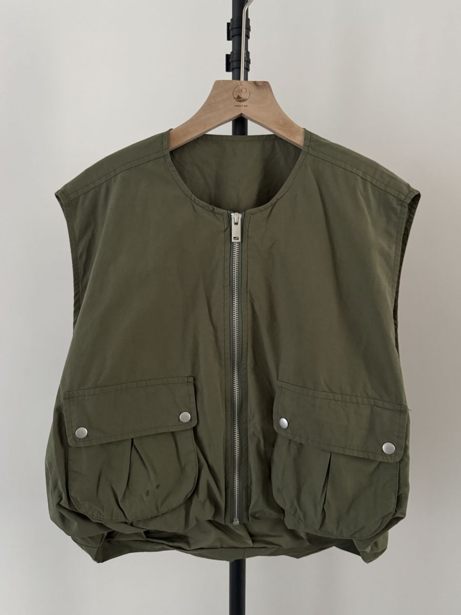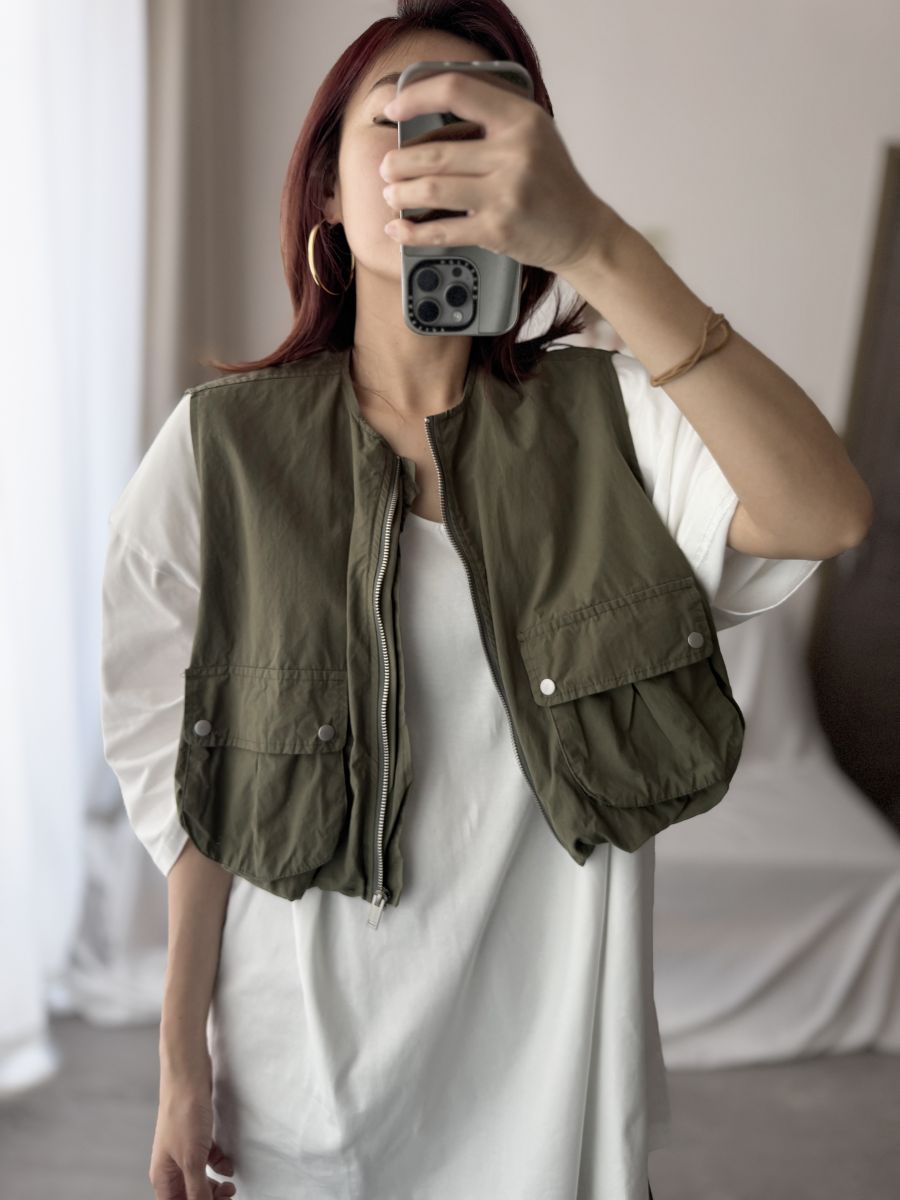 立體口袋拉鍊短版背心 (軍綠)